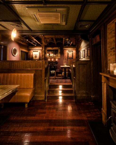 Warm, cosy lounge area with leather seating and ambient lighting at Scotts Hotel Killarney.