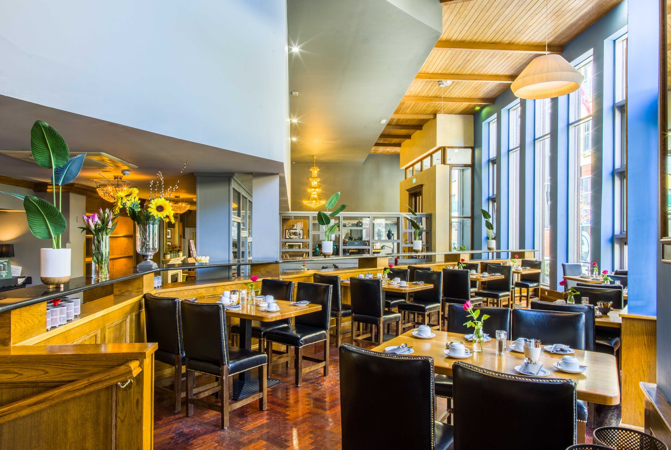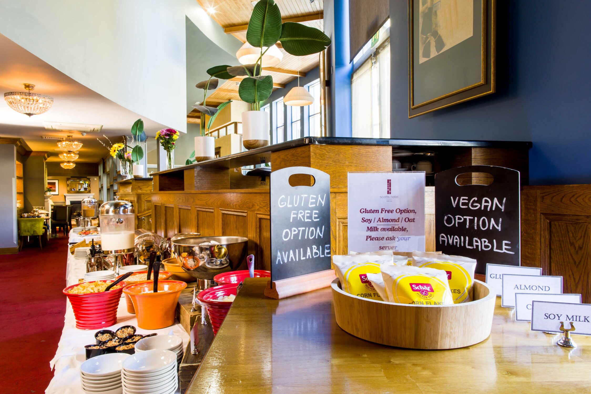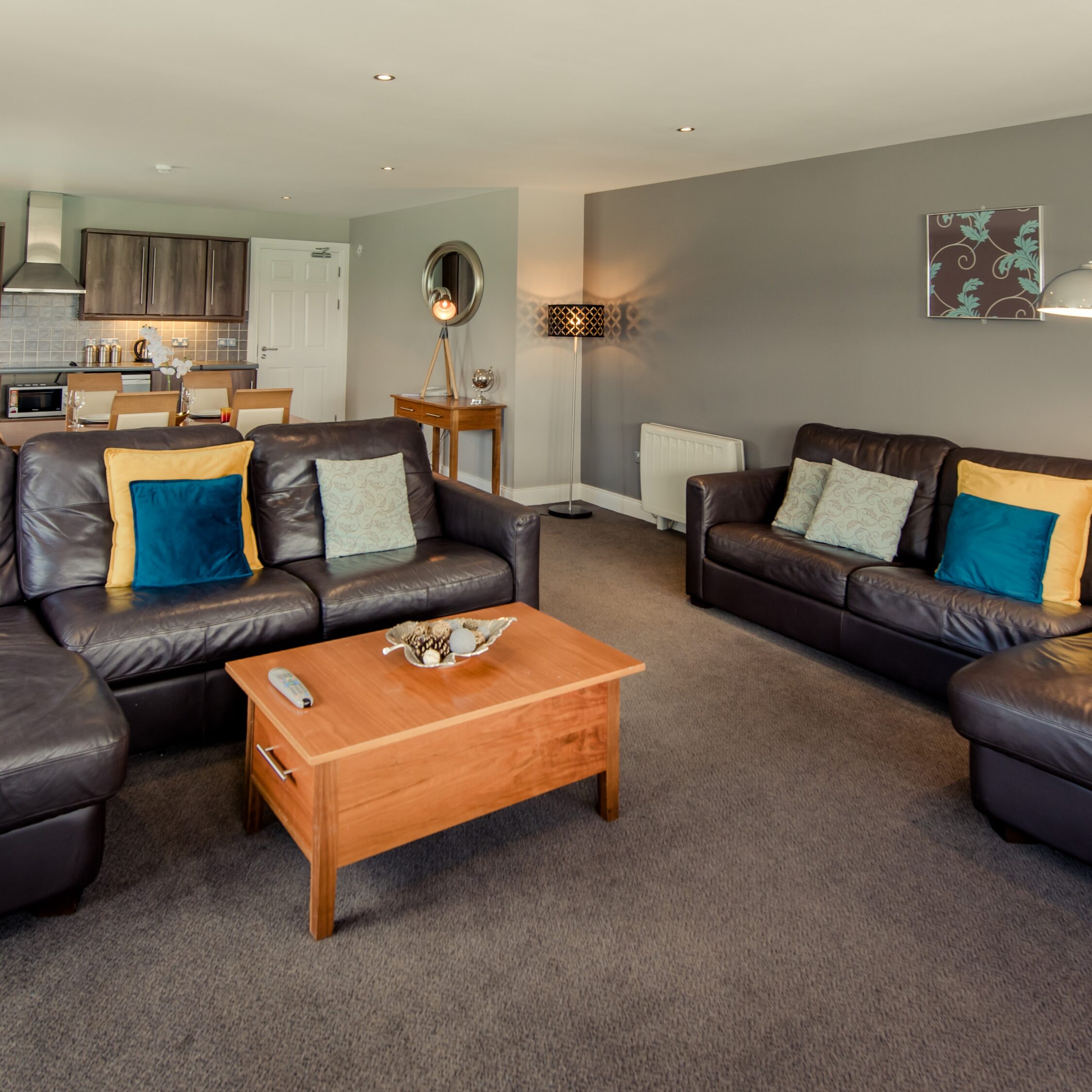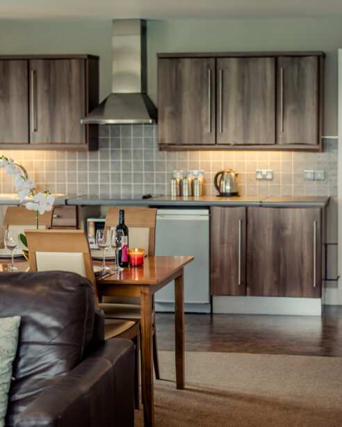 Modern kitchen lounge area in Scotts Hotel Killarney with dining table and stylish decor.
