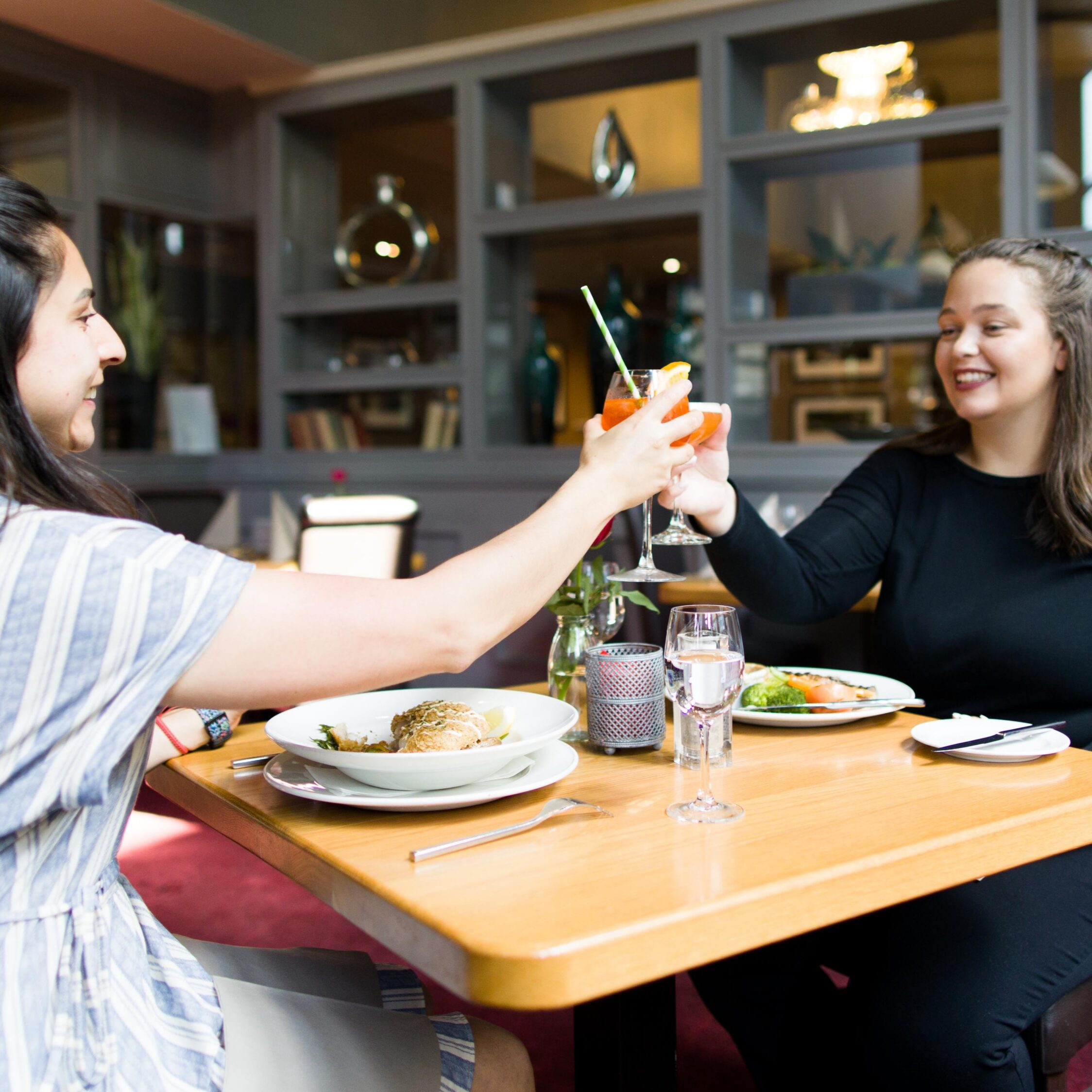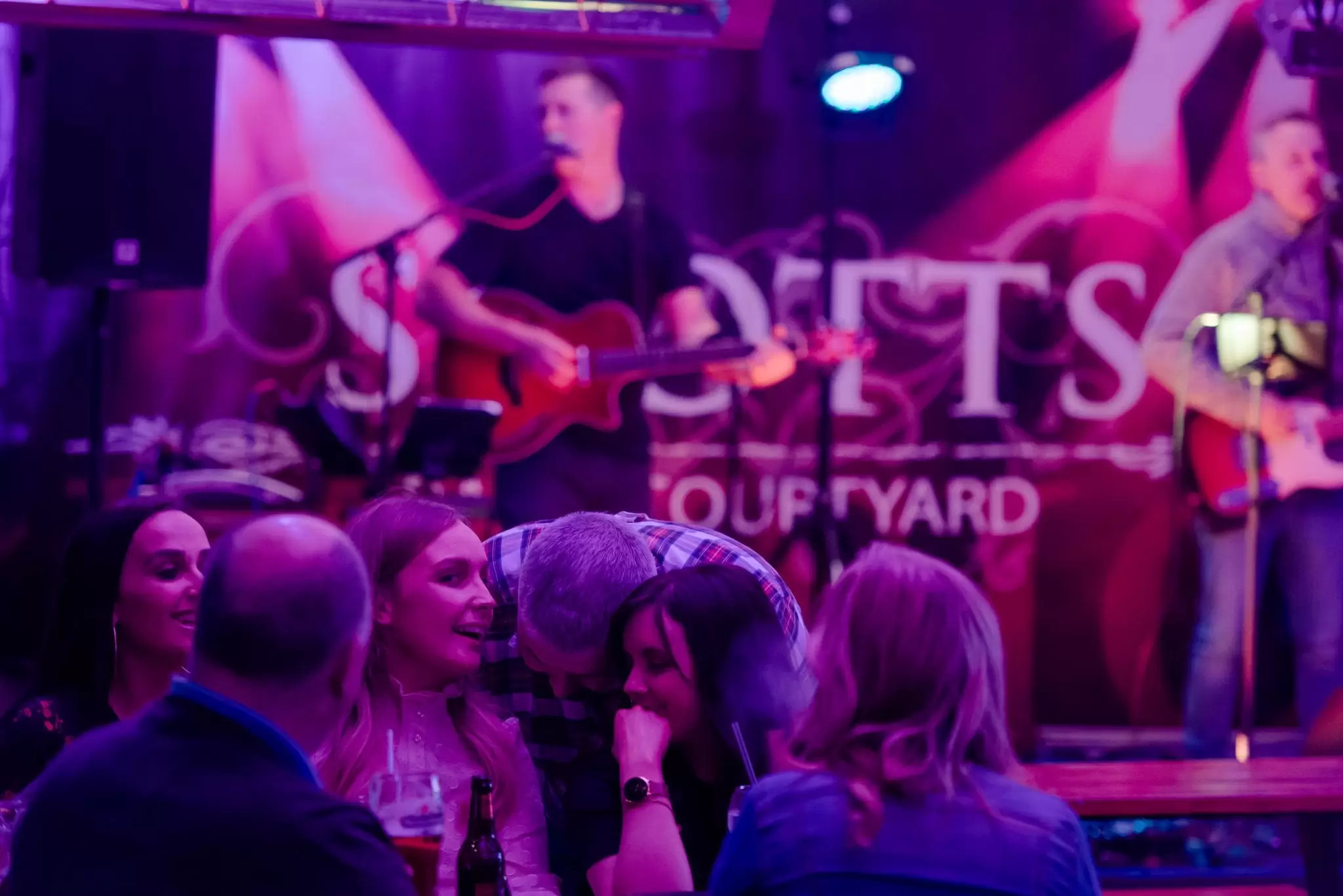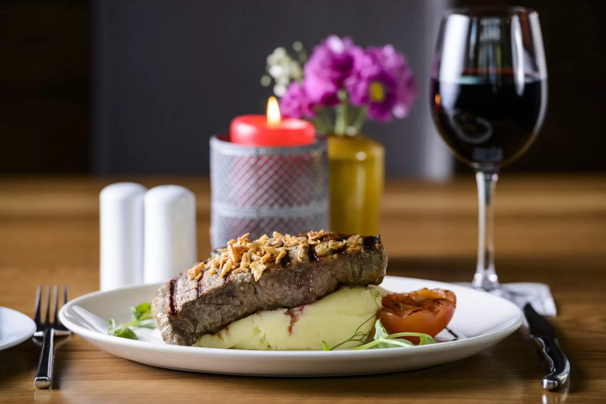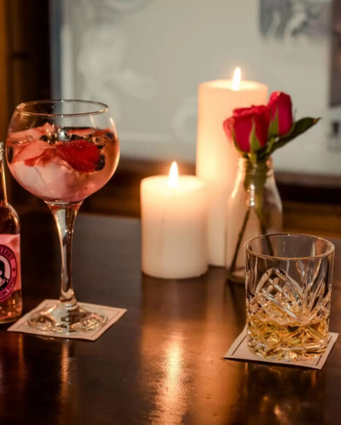 Cosy bar setting at Scotts Hotel with cocktails, candles, and roses, creating a warm atmosphere.