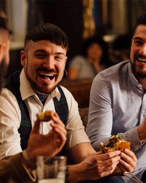 Three men enjoying burgers and laughs at Scotts Hotel Killarney restaurant.